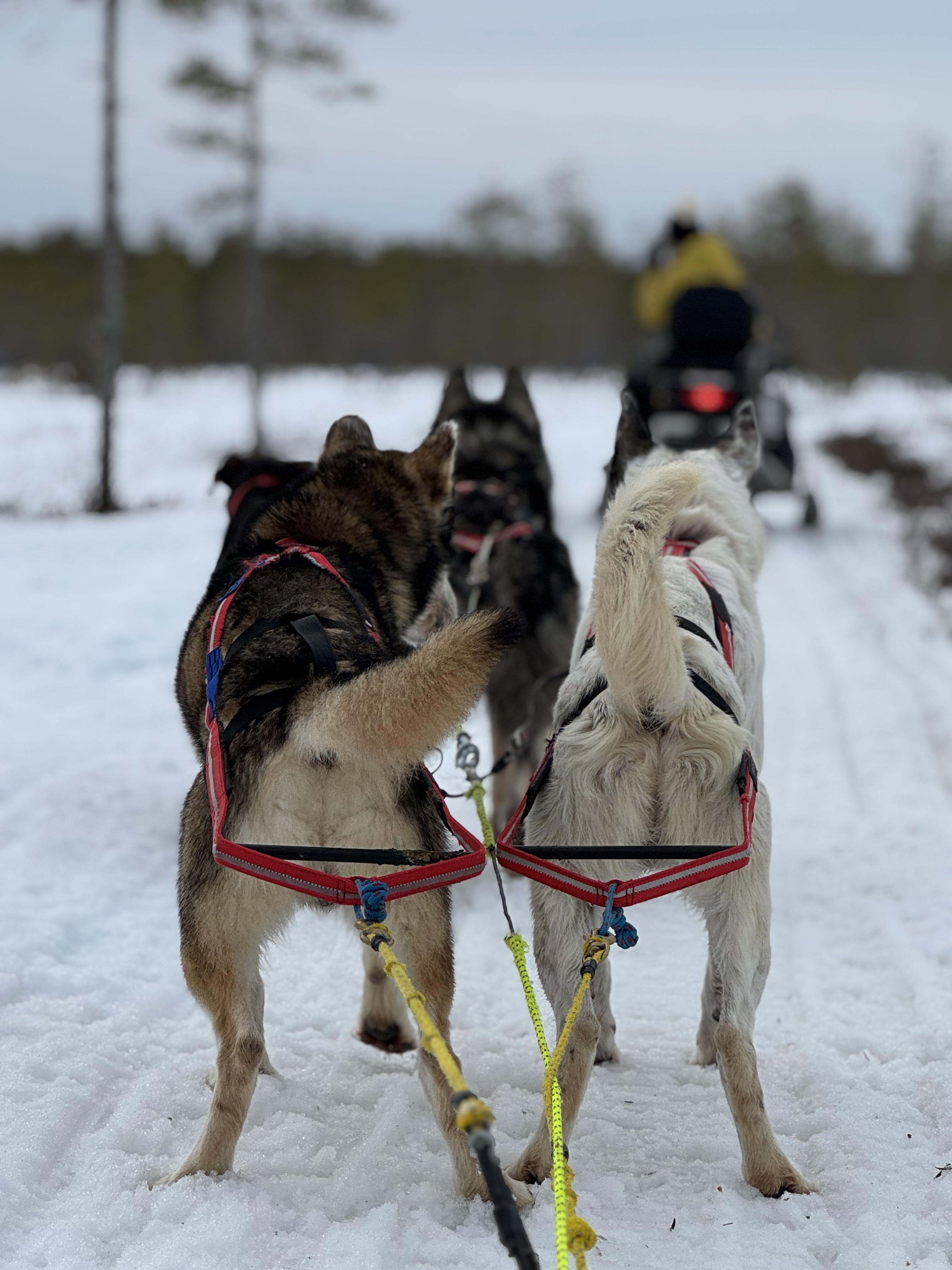 Verleihen Sie Ihrer Husky-Tour einen Hauch von Geschwindigkeit und Abenteuer mit einer geführten Motorschlittenfahrt über zugefrorene Seen und Waldwege.