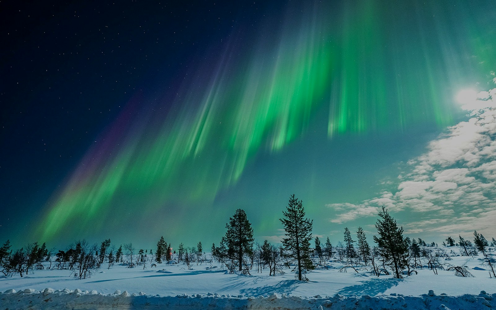 Jagen Sie die Nordlichter auf einer magischen Rentierschlittenfahrt durch die verschneiten Wälder von Rovaniemi.